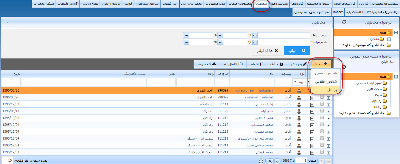 الف) تعريف مخاطب: اگر مخاطب از قبل تعريف نشده باشد بايستي مخاطب تعريف گردد. بدين منظور در قسمت مخاطبان گزينه ايجاد مخاطب جديد (شخص حقيقي، حقوقي، يا پرسنل) را انتخاب کرده و با توجه به اطلاعات درخواست شده مشخصات مخاطب مورد نظر را وارد کرده و تاييد نماييد. در جدول زير فيلدهاي مهم در خصوص اطلاعات مخاطب ذکر شده است: