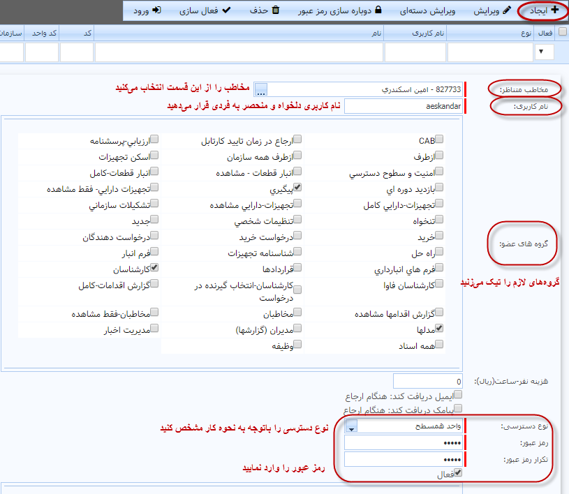| نام کاربري | اين نام، همان login name کاربر جديد است که نبايستي تکراري باشد. |