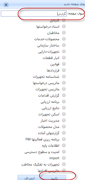 - ایجاد صفحه را کلیک کرده و برای صفحه خود یک عنوان مناسب انتخاب نمایید، مثلا گزارشهای تحلیلی.