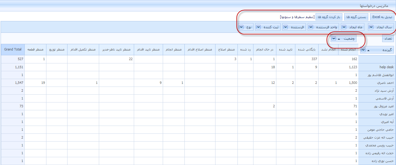 پاسخ: از قسمت فیلدهای گزارش ماتریسی با توجه به گزارش مورد نظر خود هر فیلدی را که میخواهید در سطر قرار بگیرد، با drag&drop به قسمت سطرها و یا ستونهای گزارش انتقال دهید. این تنظیمات برای دفعات بعدی به همین صورت ذخیره خواهد شد.